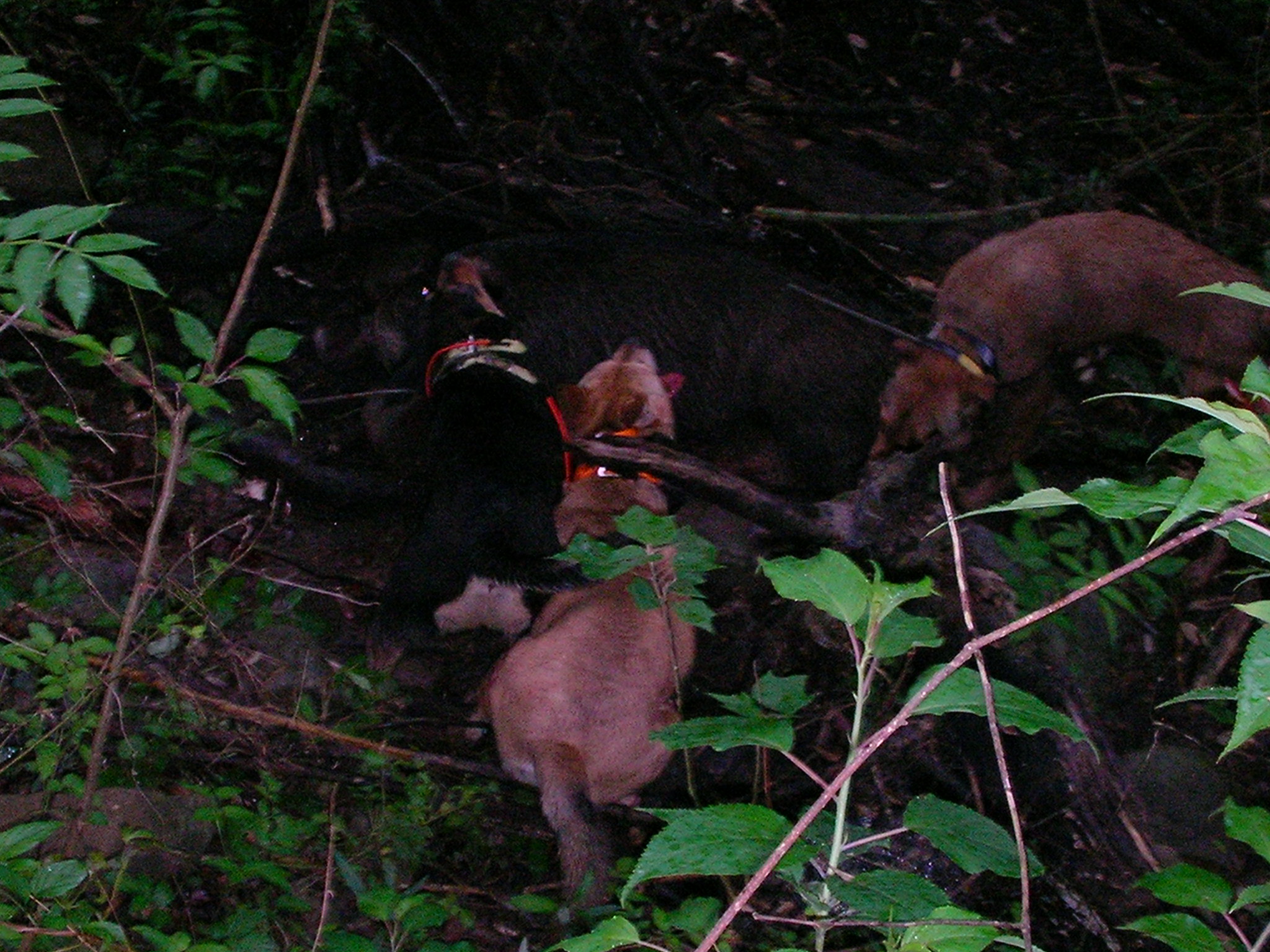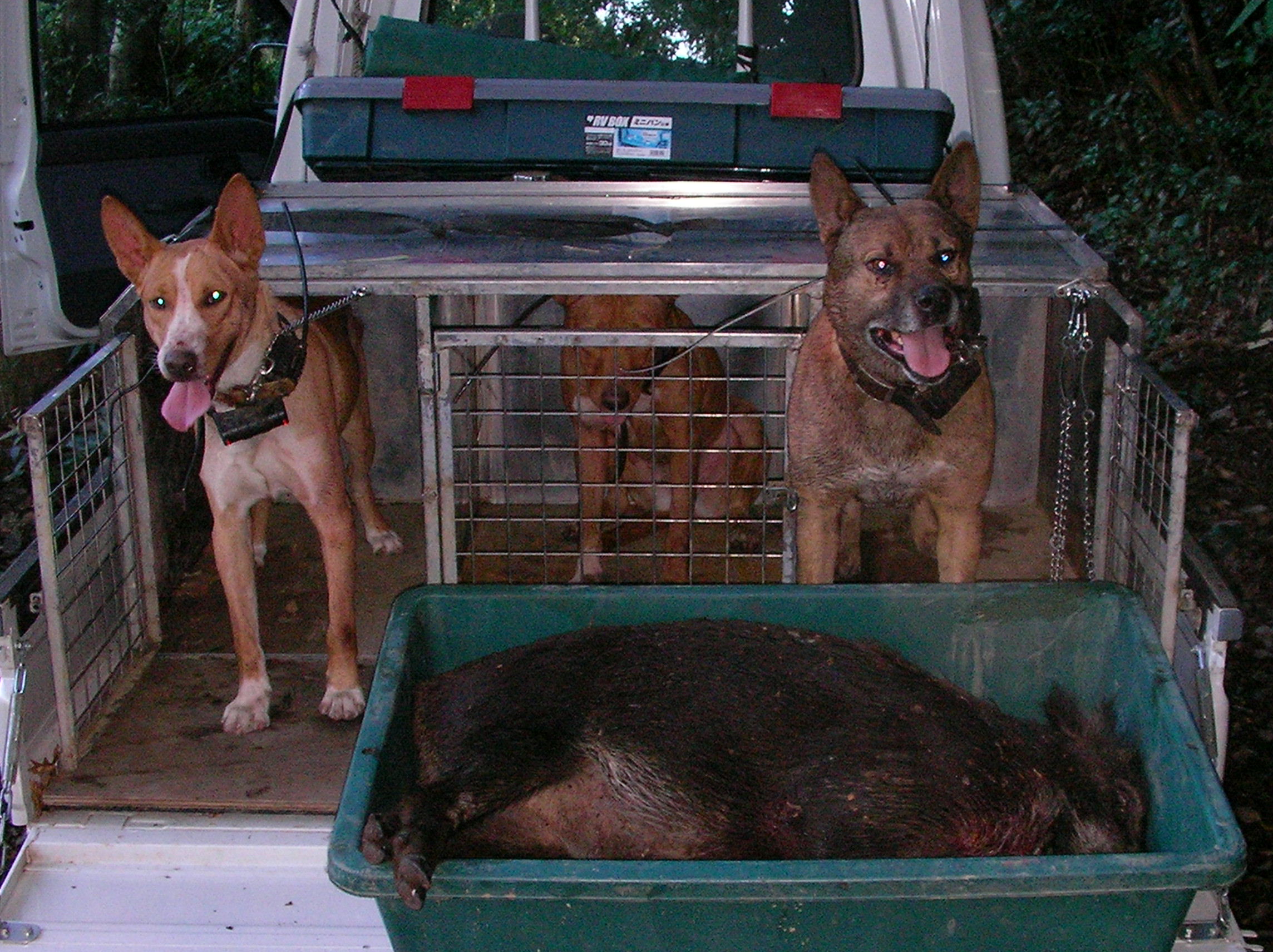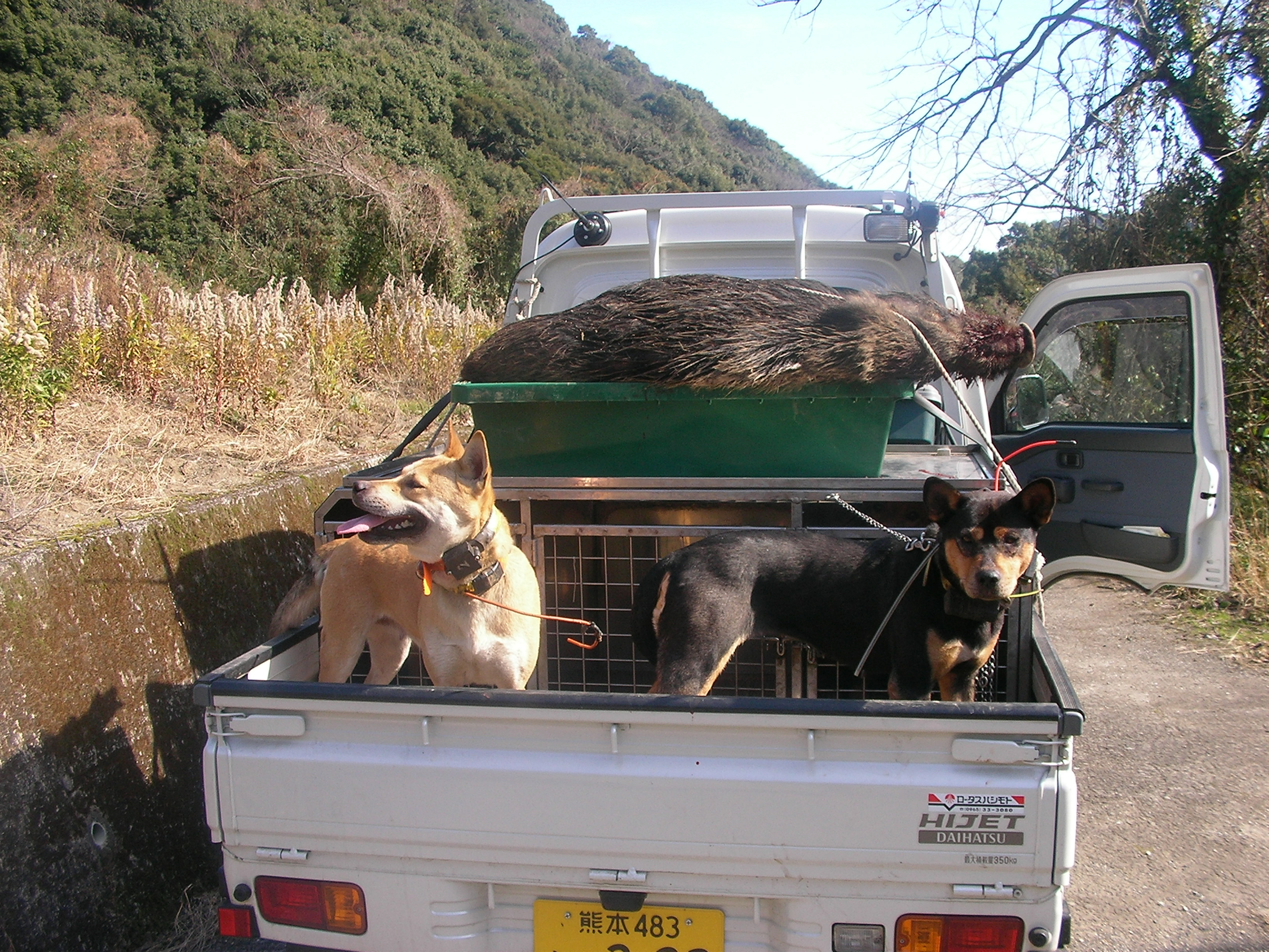 両親とも南九州の地犬系です今日で25日、丸々とした良い子犬 当方からお譲りしたメス親犬です、持ち主はこの1頭で単独猪狩りをしています、(友人と同行もしているみたいですが)もちろん猟果はコンスタンスに捕獲いたしています、怪我はそこそこしますので、もう1頭欲しいと言う事で私の犬では無いとだめと言うわけで我がオス犬と頑張った? 彼は私より歳は上だが、私の犬を猪猟を始めたときからもう数頭使っている、(途中他の犬も入れたみたいだが?) がち犬は1頭か2頭引きで少数精鋭、この地で私の犬を飼って地元の猪猟師に『こんな犬で猪が獲れるか』と馬鹿にされたが、猪が何ぼでも獲れて一躍有名になって人、 良い犬を持てば1年生でもベテランが(自称か?)スリョッて来る・・・ 猪犬の血は代々受け継がれる・・・ 顔が細いのは真ん中の祖母犬(新田犬系)に似たのか?今では我が家の主力犬の1頭・・・ カメラが悪いのか?良く映っていない・・・ 有害駆除で活動する我が家のアマゾネス軍団・・・ http://youtu.be/UhJrm3XL2Wg良く映っていない動画です約40キロのメス猪、下の写真はアマゾネスに咬まれた猪・・・手足ズタズタでお犬様のご飯が沢山出来た? |