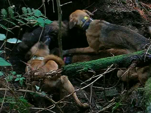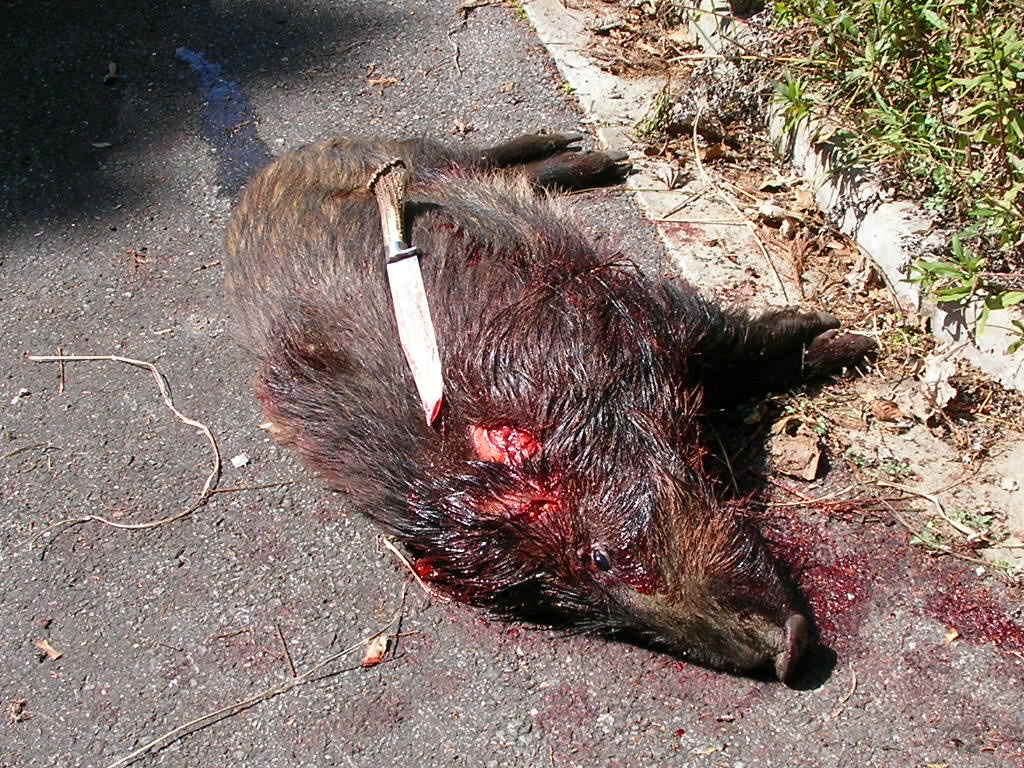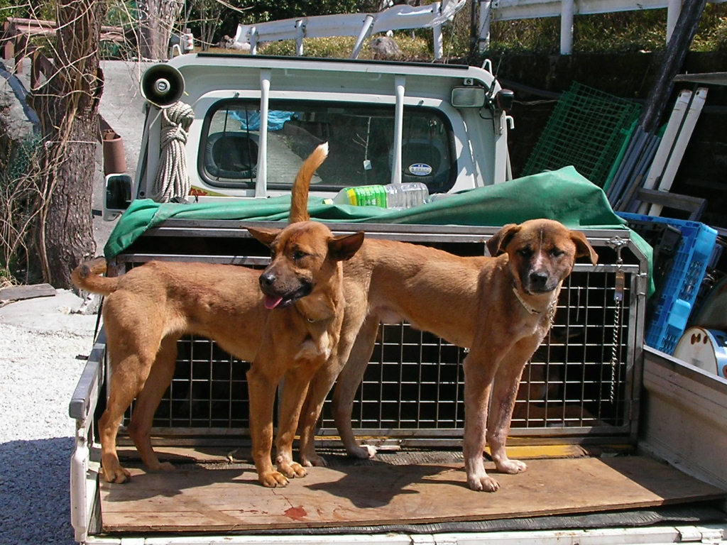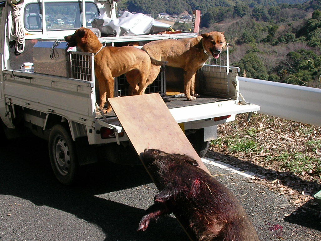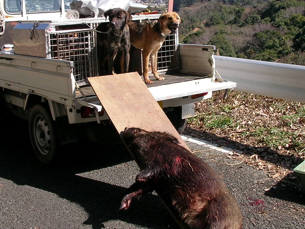 結果はオス猪の60キロくらい1頭、何とか最後の日まで猪が獲れた山の神に感謝、来猟期も豊猟であります様に、なぜか今日はカメラ無しゴメン。 今年も犬の怪我や変な出来事など色々有りました、良いことも楽しかったことも沢山有りましたが、 猪は沢山取れましたが気になる犬の怪我も・・・大丈夫かな?気に入った犬ほど怪我をする?次の猟期まで犬を仕込まなければいけない?(毎年の課題のような気がするが?)、また1年歳をとるのか? 電話などで聞くと皆さん猪は沢山獲れたみたいですネ・・・やはり全国的に猪は多いのですね、数だけ聞けば私など足元にも及ばない方がいらっしゃる、うらやましいですね、私も単独で出猟日の数以上に猪は獲っているんですけどね・・・『マダマダ精進せねば』 だが歳がな~少し気力がなえてきた?でも今年も頑張る? 3月14日単独、メス猪約50キロ 今年最後の遠征猟・・・獲れなければ1泊の予定が獲れちゃったので帰る・・・このメス猪にロンが足を咬まれたのか少し怪我、たいしたことは無いようだが痛いのか?足を突かない少し心配? 今日は、あまり行く気は無かったが、後日にちも無し、行くがチョンボ・・・忘れ物、仕方なく引き返し時間もあまり無く自宅の近くで猟・・・ マーカー付けて20分で小さいけど獲れちゃつた?しかしこの猪は痩せていた・・・センベイ? 料理する時間も無く知人に犬の餌とした提供・・・ 明日は休みで遠征猟楽しみだ・・・(魚釣りと同じで遠くに行くのが好き)。 http://www.youtube.com/watch?v=p8eSBOec_nM 動画です。 昨日10日は、K県出張の疲れか?朝起きれなかったので約2時間流したが風も強かったので探知なし・・・ 今日はどこへ行こうかと考えたが、以前行った所へ久ぶりに行く、今猟期初めて。 だが終盤とも成れば猪の形無し・・・単独だと型など見つけていては日が暮れる、今日もだめかと半分あきらめていたが帰りの道中やっと探知、1時半猪回収・・・ 約40キロのたっぷり肥えた良いメス猪・・・捕まえたところも林道の横の側溝、楽チン・・・だがナイフ刺しの時ナイフのつばと側溝のコンクリートに指を挟み痛い・・・ 猪と犬は動画より抜いたのでよく映って無いが、刺した後の猪と湯剥きのたっぷり肥えた猪、骨抜きは明日・・・ 後は14,15日の2回・・・ http://www.youtube.com/watch?v=w2FL5P-Zz4I 動画です少しですが・・・ 3月8日、単独、オス猪20キロ。 今日は県北に行く2度目、獲れたのはごらんの20キロくらいのオス猪、さすがに猟期も終盤ともなると道に形が無い?この猪も追い立てられていたのか?痩せていた、犬のオカズに持ち帰る。 3月9日、今日はお休みなので隣のk県に行く、知り合いのM氏の案内で探知猟、結果は散々でした?猪は居たのだが2連敗・・・情けない・・・恥をかき (人生恥だらけだが) おまけに猪を起こしたのと同時にパンク・・・今回はタイヤの横を切りバースト、新しく変えたばかりでまだ1000キロも走っていないのにトホホ・・・ 遠くの新しい所に行くと猪は獲れずに良いこと無し・・・(そんなに良いことばかりは有りません、と、天の声) いつもニコニコ顔のM氏に1日お付き合いいただき、猪も獲れずに申し訳なかった、マァこんな事も有るサ・・・明日から後数日頑張ろう? 3月5日単独、オス猪1頭。 昨日は1歳の子犬を連れて行ったが、やはりドライブで終わった、帰る頃に探知したが、時間も無く、林道の尾根近くだったので、間違いなく猪だと思ったが犬は放さなかった? 林道は猪の型が有ったので、昨日は猪を獲る気が無かったが、今日は猪を獲る気で出発・・・ デ、獲れたのが約50キロのオス猪。 林道を流して、なんとなく感じるが探知しない、ここだと思ったところを5回通り、やっと探知(風の向きで苦労する) 犬4頭で捕獲・・・なんと3本足だった・・・が、よく肥えていたメスだと思ったがオスだった、犬が多いのでナイフ刺し・・・ 写真は左がロン親娘、右が姉妹1,5歳。 引き上げるにはかなりの谷底・・・人では到底無理・・・で、ウインチの出番でスイスイと約50メーターを引き上げる、楽チンだー (2度ほど往復しなければいけないが) 犬4頭で捕まえたのでご覧の通り猪は傷だらけ・・・犬のご飯のオカズが沢山出来そうだ?今日はこれまでで仕事に行く骨外しは明日・・・ 後10日で今年の猪狩りは終わる・・・冷凍庫は一杯だが後何頭獲れるかな?。 写真は林道から見た谷、谷底で止めた・・・、湯剥きの約50キロのオス猪、犬の御蔭で猪が頂けます、我が家の猪犬に感謝・・・。 |