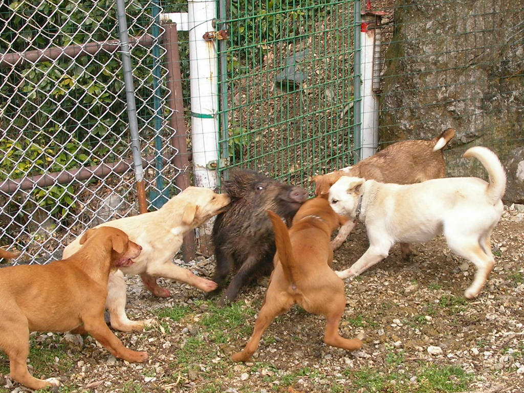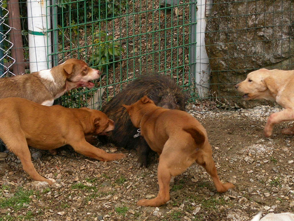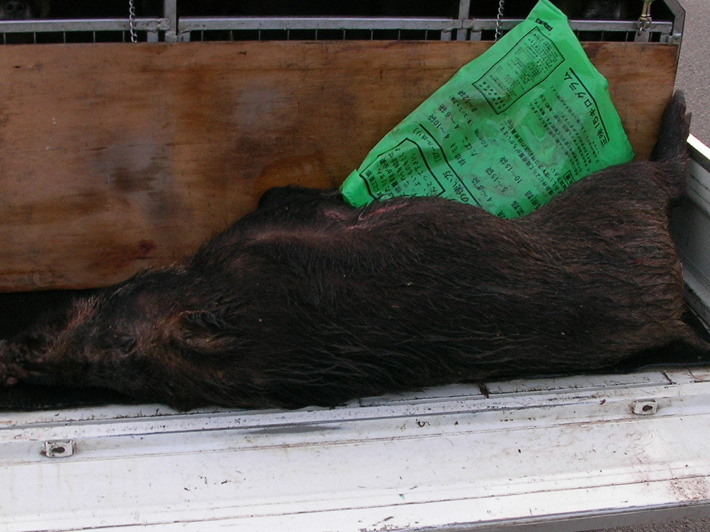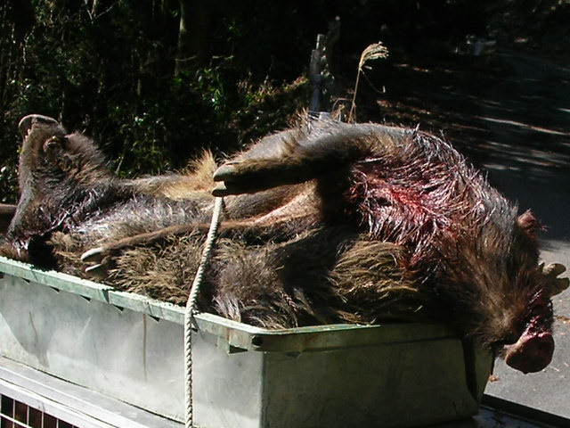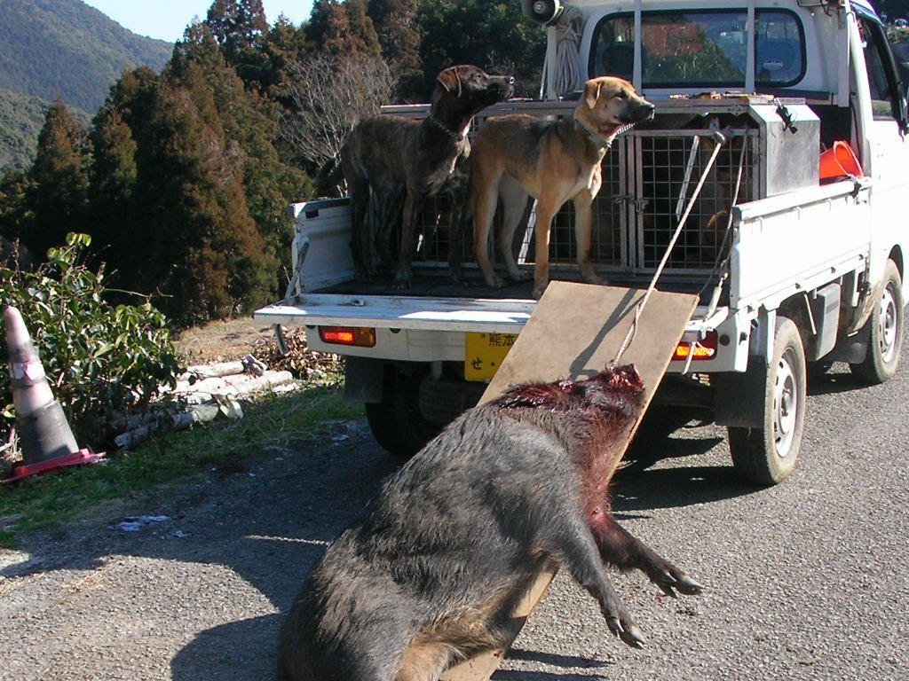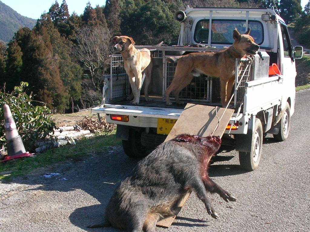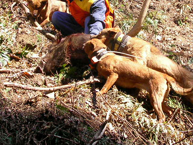 × [PR]上記の広告は3ヶ月以上新規記事投稿のないブログに表示されています。新しい記事を書く事で広告が消えます。 3月2日、オス猪2頭。 友人と猪狩り、(友人は銃なし)今日の俺は本当に友人が呆れるほどに弾が当たらない、どうして? 1頭目の猪は約85キロ(肥えていれば100キロ級) 止めるまでに弾4発・・・(友人の犬を使用) 2頭目は約55キロに1発・・・(猪が止まっていた) 3頭目は4発、逃げられた・・・(距離5メーター)思わずため息『ア~ァ』『大寺は犬は良いが、本当に射撃が下手だねと』あきれ返る、(この友人は俺より年上、猪狩りはこの地にこの人有りとのでかなりのベテラン) 俺も遅ればせながらと、肩付けと射撃の練習をしなければいけませんネ。 友人の犬も俺の犬もヤラレタ・・・午後2時過ぎ3頭目は逃げられたのでもう帰る・・・写真は2頭の猪です、 2頭獲れたので良いように思えるが、心の中は雨・・・弾が当たっていれば今日は3頭・・・?(欲張りです) 1,2頭は俺が勝ち、3頭目は猪が勝ったのだ・・・山の神はそんなに甘くは無いですね・・・ 次から頑張ろう1歳の若犬を明日は引く、猪は90パーセント獲れないだろうが?マグレもあるので? PR 2月23日水曜日、今日は皇太子様は誕生日だが、おいらも誕生日、歳は内緒・・・ てな訳で、今日はお休み、先日『リー』号がやられてションボリと帰ったところにリベンジ? 今日は獲れた、猪3頭・・・猟道も同じ行程、 あさ1ばんに獲れたのは、約35キロのオス猪、この猪は最低の肉?今年1番の猪で犬の餌に持って帰る・・・(だが牙だけは60キロ級の立派な牙だ) この猪では帰れない、気を取り直し次のポイントを流す・・・発見するも約100メータータマが当たらない・・・近くでも当たらないので100メーター以上ではあたらないのは当然か? 次は中々見つからない、午後遅く探知・・・『ロン』1頭で吠えとめ?『さー何処だ?』 車を回すと後ろで『バウバウ』 『アリャパンクだ』 ロン『はワンワン』気はあせるがパンク修理・・・『ナンテコッタ?』 タイヤ交換を終わり?を見ると川のそば孟宗竹の山を登る、『居たー』丸々としている・・・距離5メーター1発で2頭目、止まっている猪には近いと当たるのだー。 若犬が居ない・・・?を見ると戦っている様子?探してみると子猪1頭、若犬1頭で小さいなれど初手柄、他人はなんと言おうが立派だ・・・ 写真がどうしても載せれない?なんで? http://www.youtube.com/watch?v=bnUAWKxjBsMこれで猪を引き出す時の動画を見てくれ(面白くは無いけどナー)約55キロのメス猪です、良い肉であろう?解体は24日です。 何とか写真が載せれた、左が約35キロのオス猪の牙、右は約55キロのメス猪、肥えてる様だが脂は思うようにはは乗ってなかった、だが脂はちょうど良い。 2月21日、単独、オス猪65キロ。 若犬が先日やられたので、別の若犬を『ロン』に付ける、右の写真は1,5ヶ月メス2頭、左の写真はロンと9ヶ月の若オス。 で、獲れたのがオス猪の約65キロ・・・オスなれど丸々とした良い猪だ。 流すこと約2時間で探知、犬4頭放す・・・畑の横の崖の少し浅い穴に追い詰めた・・・見ると丸々としている牙の無いメス?だが獲ってみると、、タマ、、が有る・・・オス猪だった・・・ 猪の牙は短かったが犬が3頭少しずつやられていた・・・右写真の右の犬が1番ひどいがたいしたことは無い?修理は明日する。 場所は違えど少しはリベンジに成ったかな?明日は猪の解体・・・近頃体力が無い・・・ 犬の泣き声からして大きいと思ったので今日は動画なし・・・ 今日はサンザンな目にあった・・・左の『リー』号がやられた・・・しかも左後ろ足のモモの裏を、ズッパリと切られた・・・右の『マヨ』号もやられた・・・マヨはたいしたことは無いが?リーは足が直るか分からない?神経が切れてたら・・・もう使い物にならないかも?(過去に1頭居た) なんて悪いほうに考えが行く・・・ 年が明けて中々山へ行く機会が無い、久しぶりに行ったらこの様だ・・・アーァ 切られた写真が無いので姉妹の写真を載せる。 これでは物足りないので我が家の子犬を撮った動画を載せます、 我が家のワン子約5ヶ月に成りました。 もうこれくらいの猪は、5ヶ月に成った奴、まだ4ヶ月の奴と居ますが、先輩犬の口を?借りることなく皆でやればやれます・・・(まだ乳歯のままだが) 一生懸命やる奴、たまに遊ぶ奴、関心ない奴と、少し差が有りますが逃げる奴は居なかった・・・ 今年の猟期が楽しみな奴らです・・・ もう今年の猟期も終わります、4ヶ月長いようでやはり短いですネ・・・後は『リ-』見たいに大怪我が無いようにしなければいけませんがこればかりは・・・ クリックして下さい動画が見れますhttp://www.youtube.com/watch?v=AfT6S1lqvWU 如何ですか? |