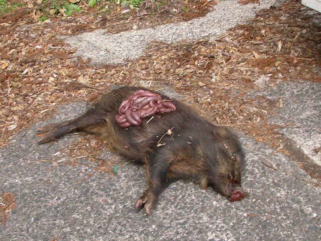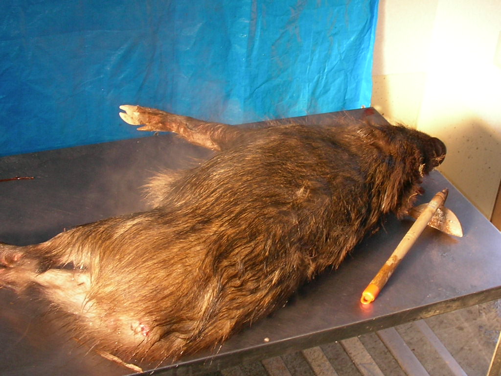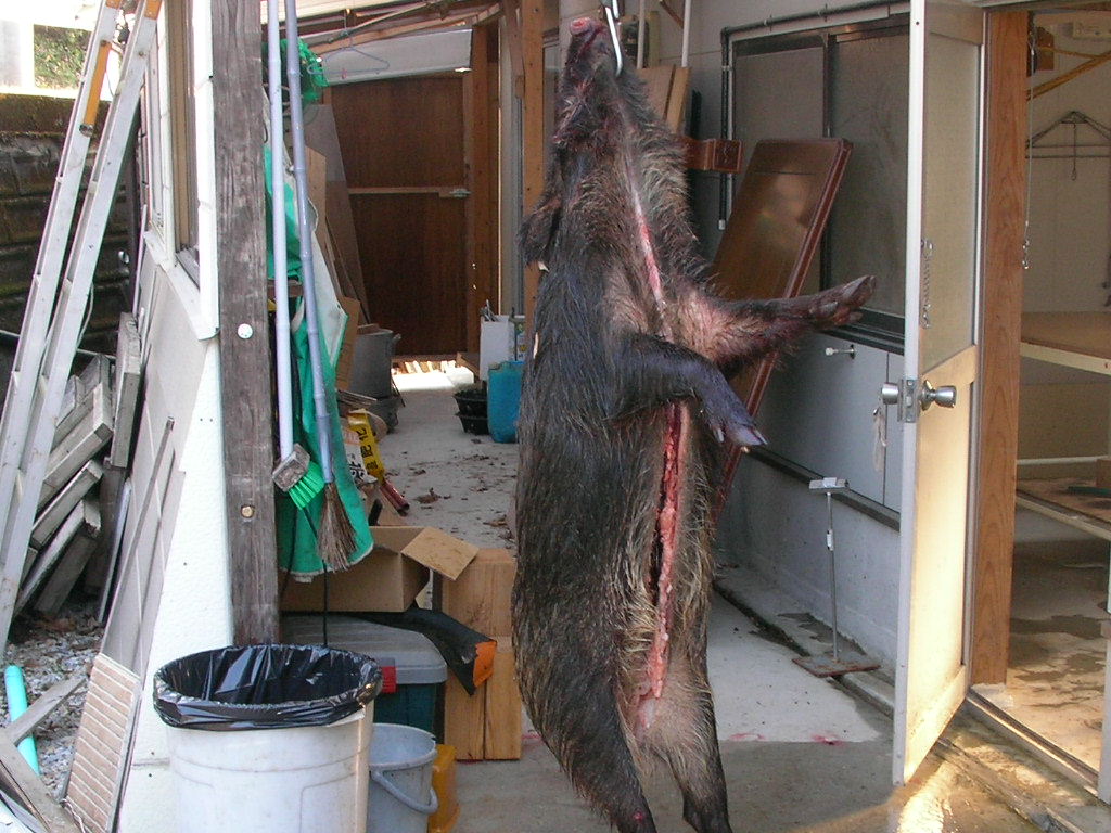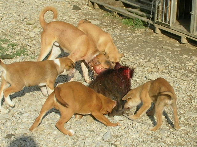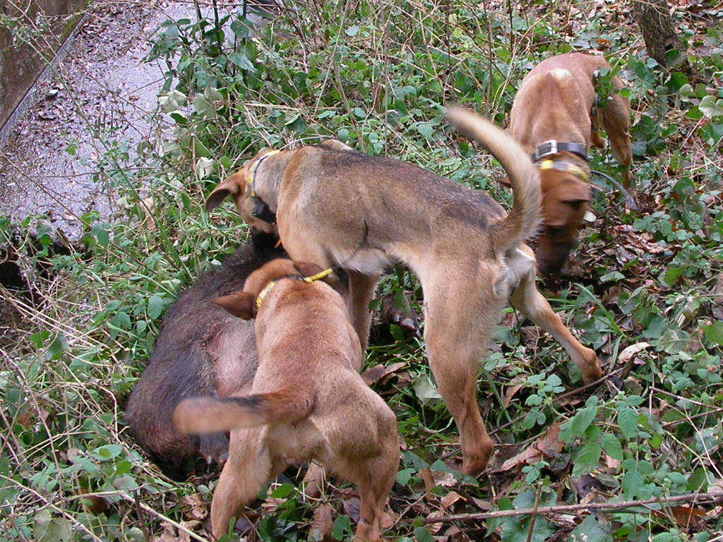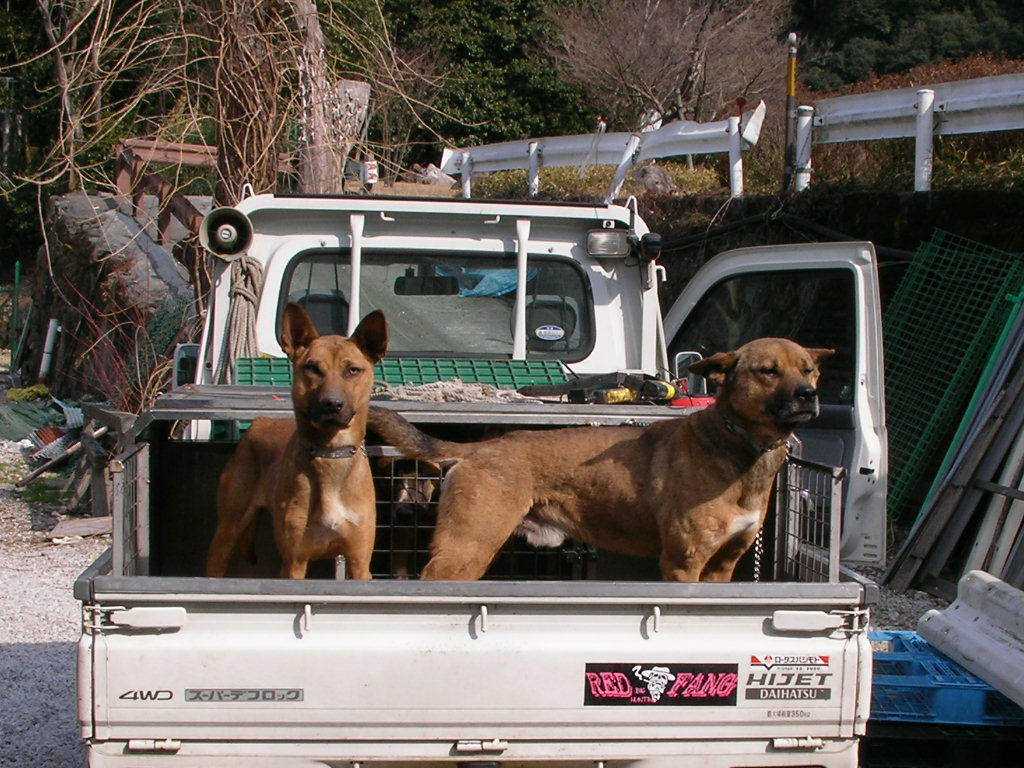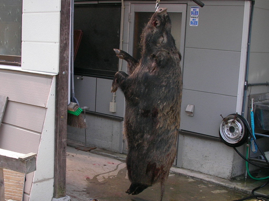 × [PR]上記の広告は3ヶ月以上新規記事投稿のないブログに表示されています。新しい記事を書く事で広告が消えます。 今日は2月3日、約1週間ぶりのブログ。 遠征は如何だったかって?サンザンでした、おいらの探知犬で、2日間猪を見つけることができなかった・・・ 猪が居ないわけではない、地元の若い友人k君が山に犬を入れると猪は居る・・・ 2日間俺の犬の活躍は無かったが、1日目は95キロのオス猪、この猪にk君の犬はサンザンやられた・・・荒猪に良くやった大したもんだ、命に別状は無いけれど、しばらくは使えないとの事。 2日目も天気予報で大雪だ大雪だ・・なんて言うので午前中には帰路に着く、この日も探知なし・・・帰った後でH氏の犬で吠え止めで70キロくらいのメス猪捕獲との連絡・・・おいらは頭を垂れてションボリ高速の上・・・ 気分が乗らなかったので捕獲の猪の写真もなし、k君すまん・・・犬はk君の犬です。 ある地方では俺の探知猟が利かないのか? イヤイヤそうでもないみたいだ、k君の話ではk君の地方で猪を1番沢山獲るのは、80歳代の人で、本人歳で山歩きはできないので、俺みたいに犬を車に乗せて探知猟だそうな、もちろん単独猟、歳で暇があるので猪も沢山取れるのだろうが。 80歳代でも探知犬猪狩りができるのなら、おいらもあと20年くらいは猪狩りができそうだ? 遠征では結果は出なかったが得るもの有った。 遊びで行ったが結果が出ないと面白くない、できたらリベンジしたいなー(また駄目だったらドウショウ) k君、o君、hさん色々と何から何までご迷惑をかけお世話になりました、これにめげずによきお付き合いをお願いいたします。 昨日遅くまで猪の処理を終えたので、今日はユックリ出発、犬は親子4頭、10時いつもの猟場を流す、においもすぐには拾えない・・・11時探知・・・『ゴー』でワンワン・・・猪が谷を下るなかなか捕まえれない、俺も道を下る・・・部落の横・・・ 『ここら辺に犬は居るのだが?』・・犬は道を走ってるみたいだ?ヒョイと横を見る大きな猪が道を走っている・・・『アレー』猪の20メター後ろに犬3頭走っている・・・おいらもアワテテ犬の後ろを車で走る・・・猪、犬3頭、俺の車で1列縦隊で部落の中を走る・・・ 約300メター犬が猪に追いつきそうになったら猪が民家に入った・・・『アチャー』横の畑に行ってくれたら良かったのだが、庭でやりだした・・・どうしたものか『困ったなー』と横の畑に追い落とすのを願うが、さらに事態は悪いほうに・・・ 犬に追い詰められて車庫兼物置に猪が入った・・・隅に追い込みもう猪は出れない、捕まえるには大きい・・・(かまれたら痛い) 民家の人は留守だ・・・ 100メター前の人家に行き事情を話猪を止める・・・後が大変だ車庫の中は血の海・・・前の人と水道の水で血を流すこと1時間・・・(猪を追い込んだ民家の庭と車庫) 子犬を探し民家の前を通ると、主人が帰っていた、車庫の中が水浸し・・・事情が飲み込めないで居たので、事情を話平身低頭謝る、事情が分かり気持ちよく『良いですよ、猪は沢山獲ってください』と了解してもらった、まったくヒャヒュの出来事でした・・・(写真は写す余裕なし悪しからず) この後にオス猪30キロの良く肥えた猪を捕獲・・・3日は処理が大変だー。 この1週間遠征からいつもの猟場と色々有ったが、終わりよければすべて良し・・・後の猪狩り犬の怪我無く、そこそこの猪が獲れたらいいなー。 PR もうすぐ4ヶ月、だけどマダマダ3ヶ月の子犬です。 猪も15キロくらいの子猪、まっしぐらに行ったのは7ヶ月の子犬?、3ヶ月の子犬も7ヶ月の兄貴を見習い、はたまた英才教育のおかげか?吠え、噛みに行く頼もしい奴らだ・・・次の猟期が楽しみだ・・・ 動画だhttp://www.youtube.com/watch?v=yAJjEZVABAQ 明日28日から31日まで遠くに遠征いたしますので少し留守をいたします。 帰ってきてからレポート書きます、吉と出るか凶と出るかブログお楽しみに・・・(恥かいてションボリと帰ってこないようにしなければ・・・) こんなに色ついたポンカンを収穫、俺のは木の上で完熟なので皮は硬いが中身は甘くてジュウシイ・・・美味しいよ 孫にお土産でーす。 寂しいので猟の動画を少しどうぞ、 http://www.youtube.com/watch?v=U82H6R_PBm0 朝、目覚まし時計より30分遅く起床・・・妻の入れたコーヒーをもらいゆっくり出発・・・8時より猟場を流す、林道に石が落ちている?猪か?犬もなんとなく感知?犬を放すも空振り・・・だが何処かに猪はいる? 山の裏の短い畑道を流す・・・詰めで探知?居た・・・ 『サー行け』と親娘を放す・・・やがてワンワン、ブウブウやりだしたが猪が小さくはなさそうだ?山の中腹から荒畑にマクレて落ちてきた、デカイ?オットリ刀(銃)で近寄るが間に少し深い三法張りの谷・・・谷向かいの藪の中のチラチラ見える猪に1発・・・倒れない?もう1発・・・まだ倒れない急所に当たっていない?、もう1発倒れた?(3発とも当たっていた) 三法張りの谷を渡り確認する