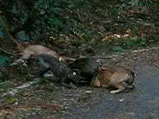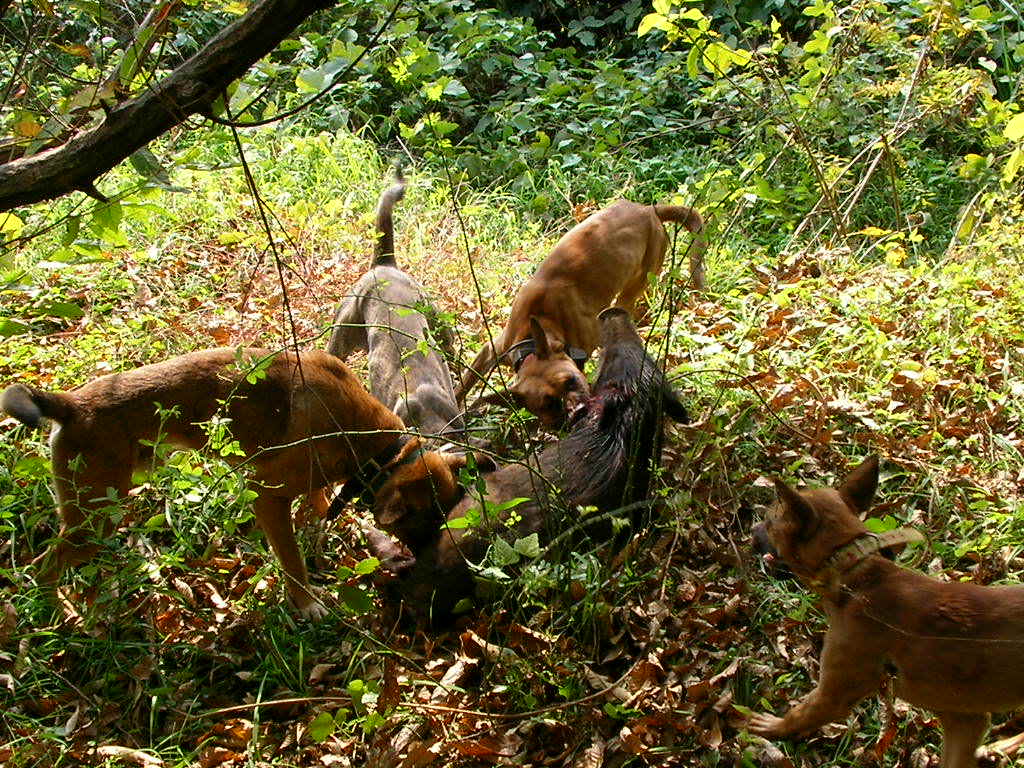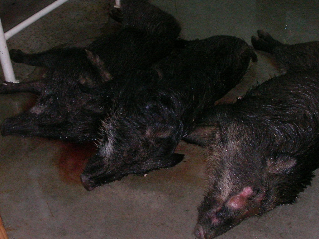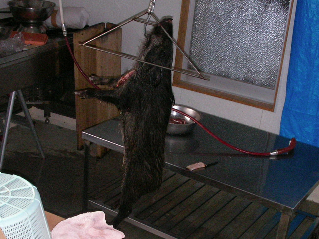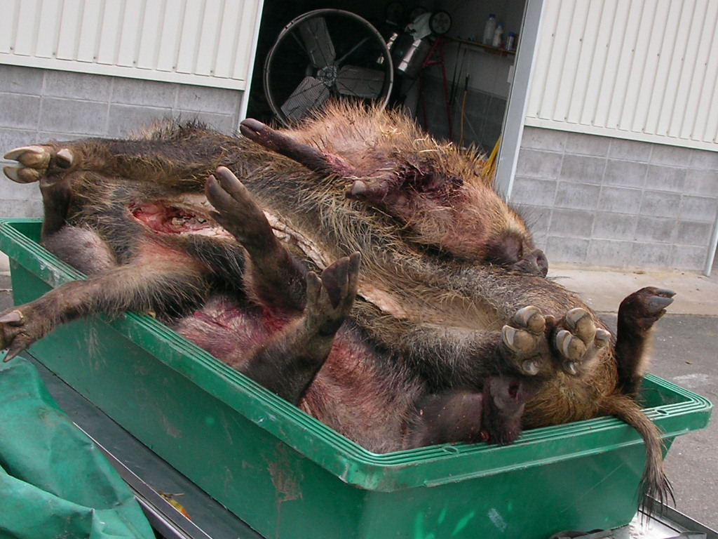 × [PR]上記の広告は3ヶ月以上新規記事投稿のないブログに表示されています。新しい記事を書く事で広告が消えます。 ナンダカンダで沢山獲れました・・・大きいのは居ない、そこそこの猪と子猪2頭、 左上は風光明媚な猪狩り猟場、右は山と積まれた猪、 左下は大きい順・・・子猪は居ない? これでも一番大きいのには逃げられた・・・親子で吠え止めを、距離10メーターよく狙い一発・・・そのまま逃げられた?『アァ』肉が傷まないように頭を狙ったのがいけなかった、己の腕の悪さを忘れていた・・・?ロン父娘ゴメンネ・・・ 次は肉が痛んでもよいので肩を撃つ・・・トホホ・・・ でもナンダカンダで大猟だ、 そんなに語れるほどの活躍は無し、ごく普通の猪狩りでした、猪の解体が大変だ、早く帰ろうとお昼過ぎに帰路へ着く。 PR 11月21日単独猟、 今日は日曜日、午前中だだけ、いつものようにポイントを流す、探知?『ゴー』で『ワンワンギャンギャン』すぐ近い?オットリ刀で近ずくと、ナナント・・・箱罠猪・・・『ガックリ』。 気を取り直し次の猪を・・・やがて見つけたのが右の20キロも無い猪、『アァ~』とため息・・・ 『次を探そう』で、12時過ぎに見つけたのが左の猪、1頭目より少し大きい?だが30キロは無し、だが情けないか今年1番の大物?トホホ・・・俺の猟は猪を獲って見ないと大きさはわからないと威張って見ても寂しいー。 だが少しずつ大きくなるかな?次を向後期待・・・ 猪が小さすぎて、参考にもならない動画ですが見て下さいhttp://www.youtube.com/watch?v=gOFDfd7zYtE 猪二頭分の動画ですどうぞ、『血沸き肉踊る』シーンが早く見たいナー?。