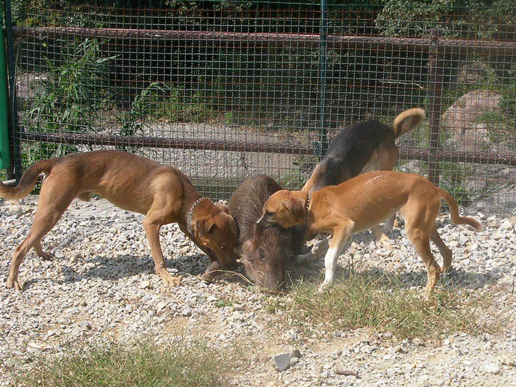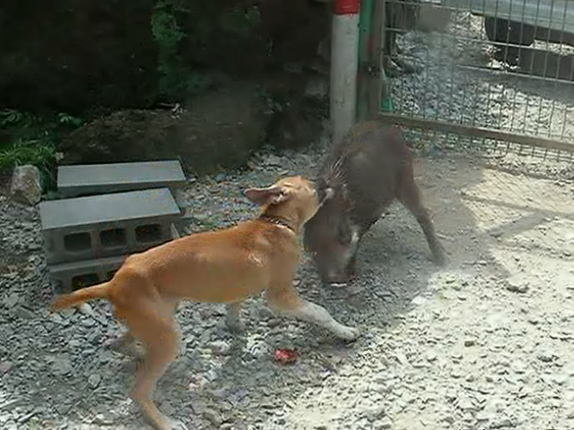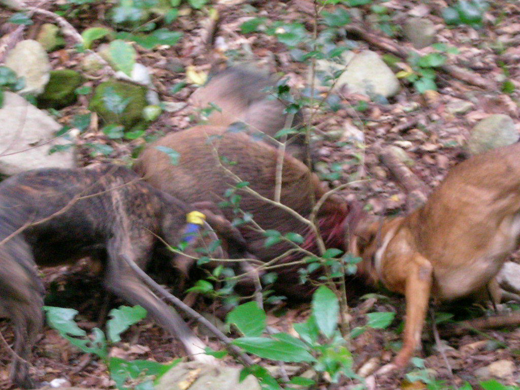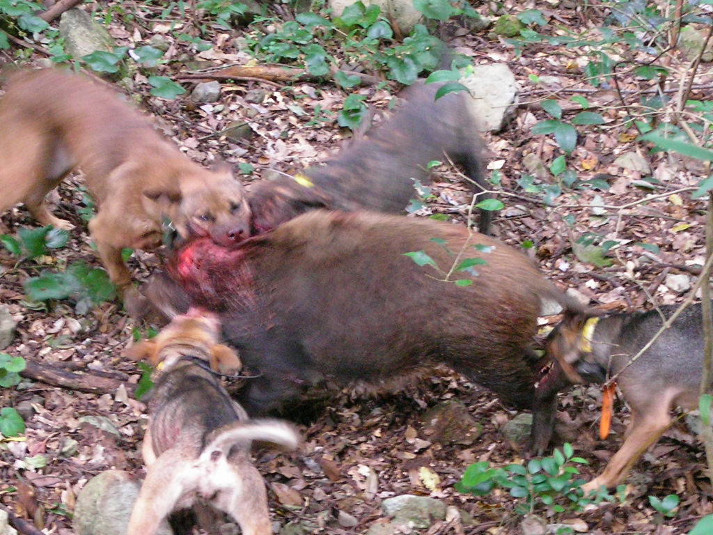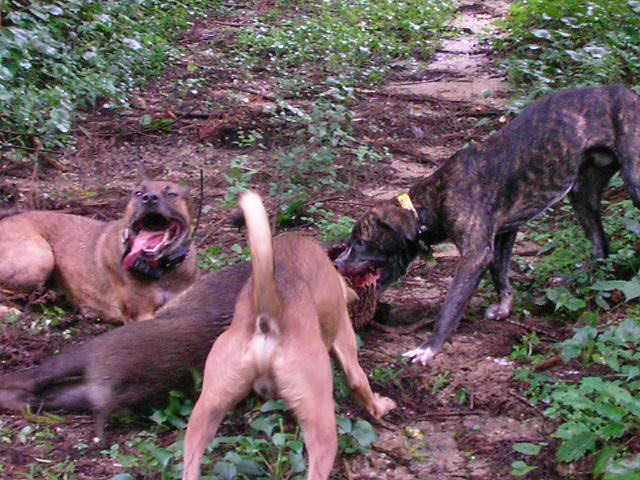 PR 27日、今日は子犬、若犬の試験・・・(猪が小さいのは、土佐犬の噛ませ犬と同じ考えで、小さい犬に大きい荒猪は禁物) ご覧の通り・・・左上は5月生まれのオス4ヶ月と少し・・・http://www.youtube.com/watch?v=NBVu0Co41ps 4ヶ月でまだ乳歯のくせにこの噛みとは・・・出来すぎ、急いでワクチン接種、先はナンバー3以内? 右上は、11月生まれの10ヶ月メス・・・http://www.youtube.com/watch?v=NVWMk2VYdcA 左下は、右上と同じ腹の姉妹・・・http://www.youtube.com/watch?v=SMM_fkTPRbM 右下は、手前左は10月生まれで、今産まれたシズの昨年子オス・・・動画は左上と同じ 写真には無いが、11月産まれの、姉妹と同じ腹のオス・・・http://www.youtube.com/watch?v=kIzljhieeDk 猪が小さいが、俺的には、全犬合格・・・後は先犬と山を引くだけ・・・ 我が家の犬は、1歳前でもこれくらいの事は致します、後は先輩と山を引き、実戦あるのみです。 右の写真、友達に頂いた35キロくらいのメス猪を、若犬で訓練、マダマダ親犬の足元にも及ばない・・・素質は有るようなので、山引きを頑張らなければイケマセンネ・・・ 左は1ヶ月くらい前・・・囲いの中ではナカナカですけどね・・・ どちらも動画ですクリックしてください、http://www.youtube.com/watch?v=6IzGtuDHeu8 http://www.youtube.com/watch?v=w18eQAJ_nnM |